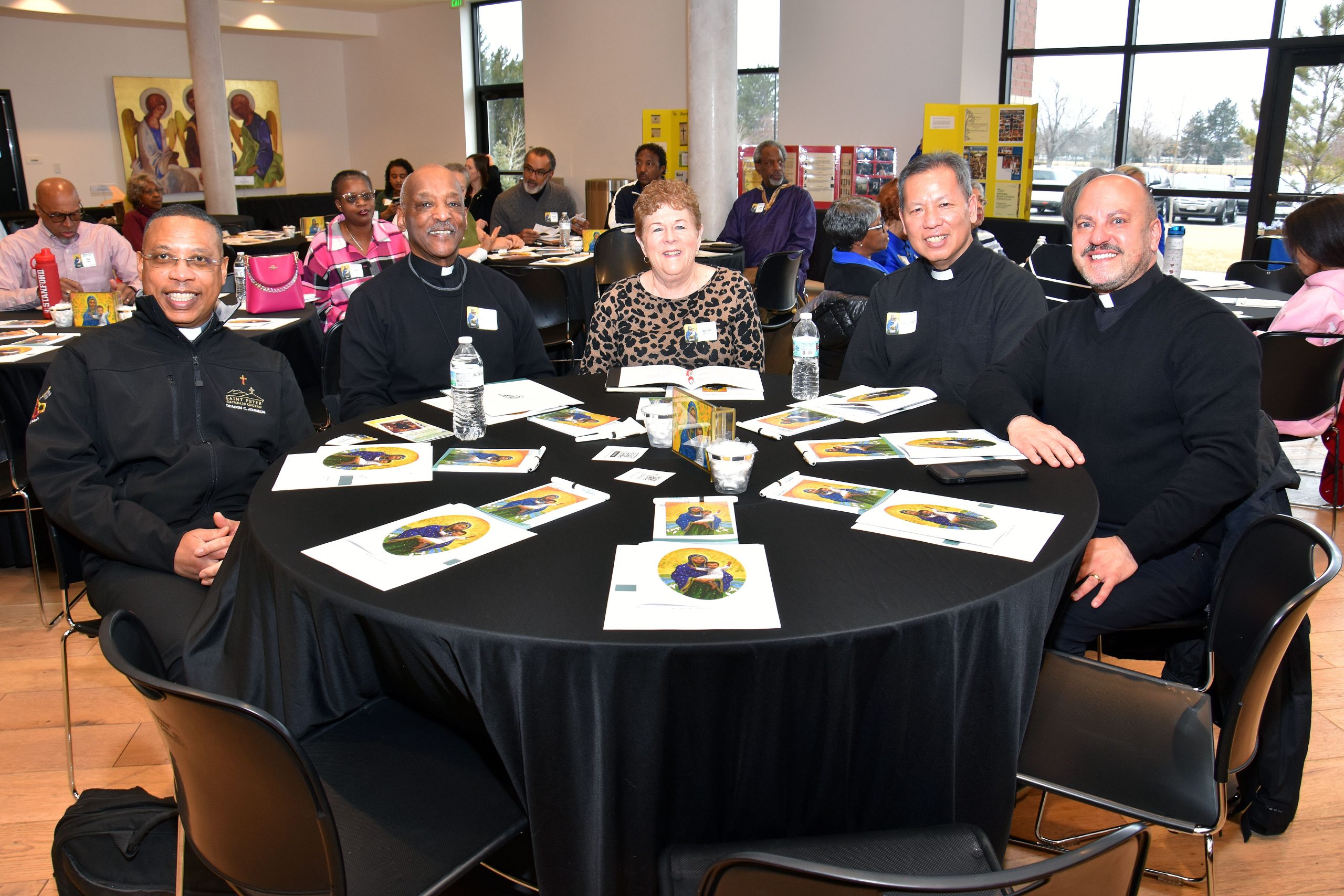 11. Wanda McDavid with visiting deacon, Clarence CJ Johnson, Deacon Clarence McDavid, Fr. Cao and Fr. Zegeer (photo by James Baca)
