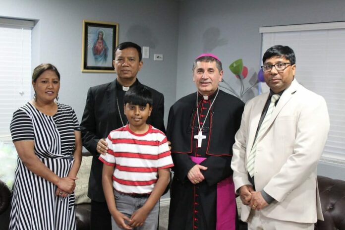 En la foto aparecen el arzobispo Sebastian Francis Shaw OFM junto con el obispo Jorge Rodríguez, Jahangir Piara, presidente de la organización Peace and Development de Denver, y su familia.