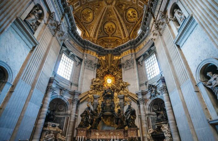 La obra de Bernini está enmarcada por cuatro pilastras. En el centro se sitúa el trono de madera, con incrustaciones de bronce dorado, decorada con relieves representando la “traditio clavum” o «entrega de llaves». El trono se apoya sobre cuatro estatuas de bronce, que representan a cuatro de los doctores de la Iglesia.