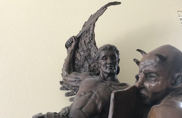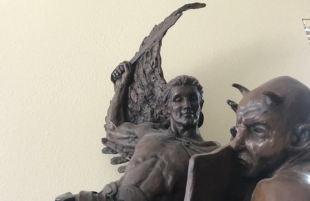 “Cuando miro esta escultura, es Dios diciéndonos que la luz vence a la oscuridad. Y en esta imagen de San Miguel Arcángel, él está demostrando lo fácil que es. Si miras el rostro de San Miguel, él es solo un niño, una pieza sutil. Y si miras las caras de los demonios, reconoces que están completamente derrotados”, dijo Luke.