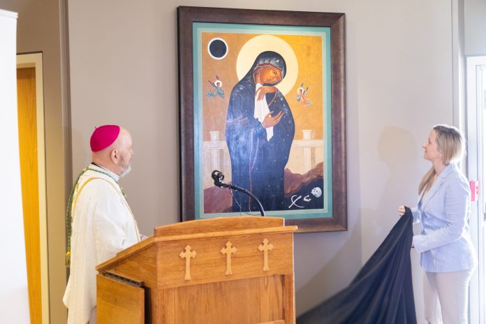 Decenas de personas se reunieron en el centro pastoral arquidiocesano para la sencilla ceremonia de inauguración con el arzobispo de Denver, Samuel J. Aquila, y Elizabeth Zelasko, una artista sacra local y columnista católica de Denver que creó el nuevo ícono.