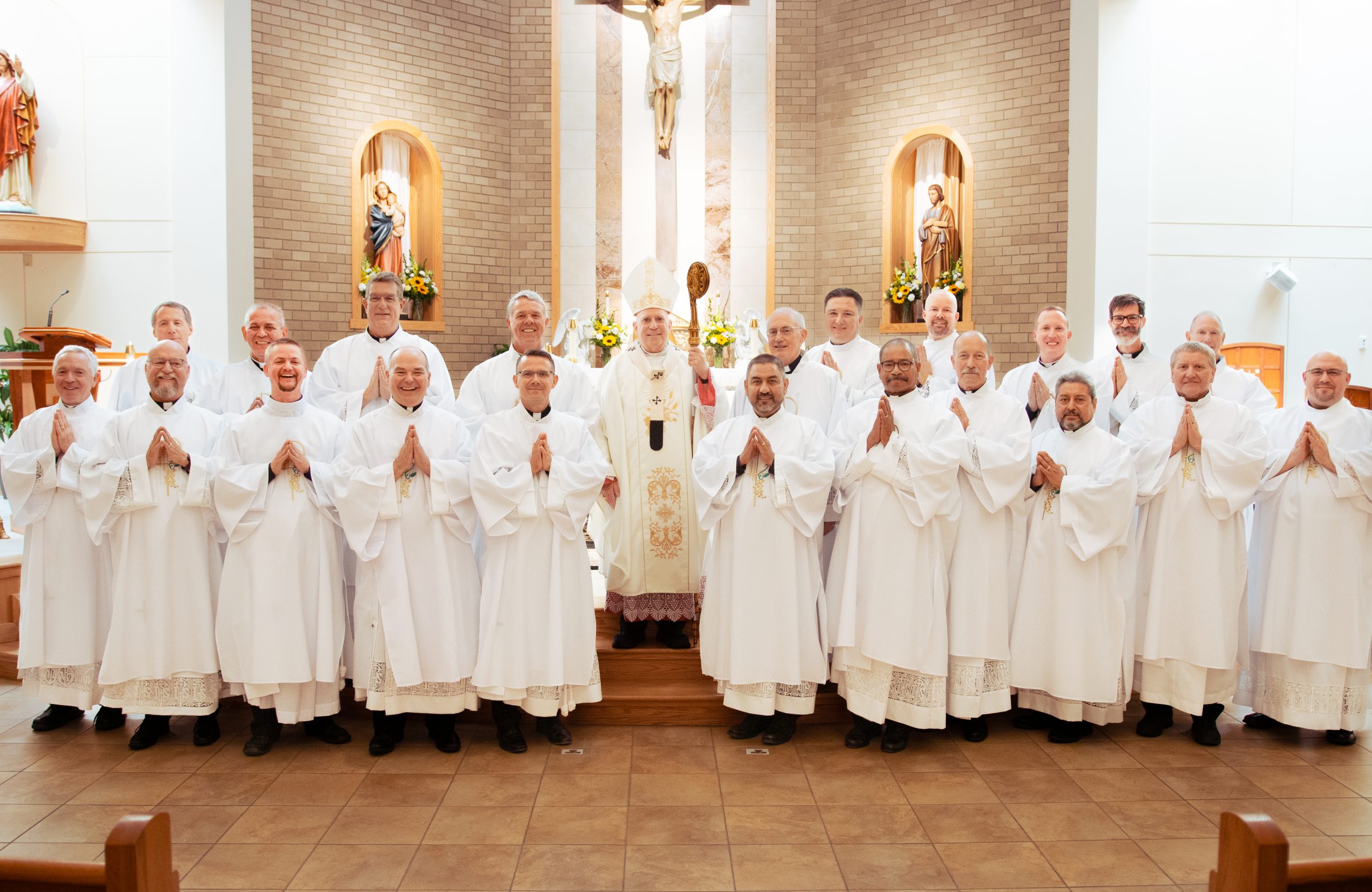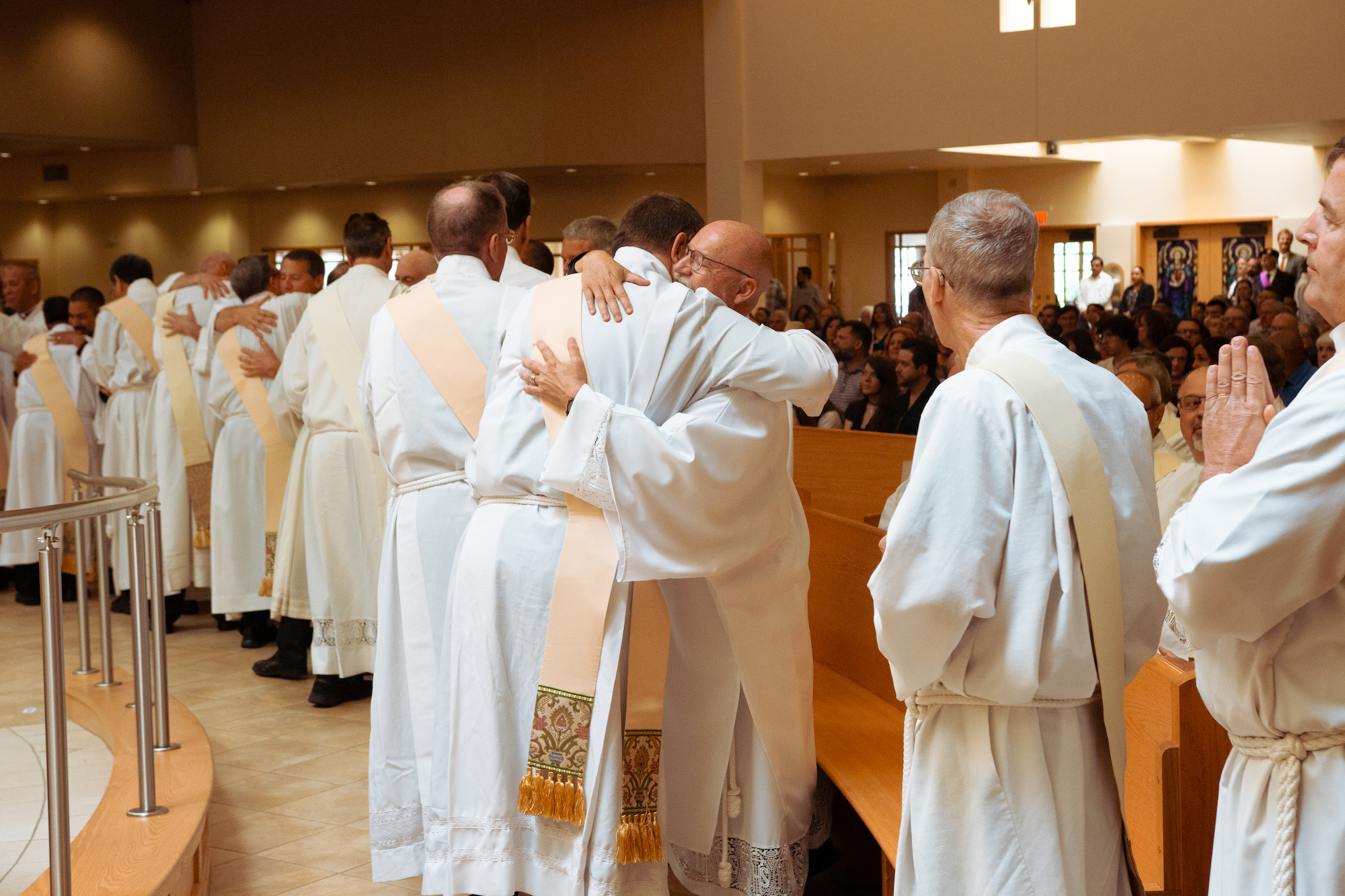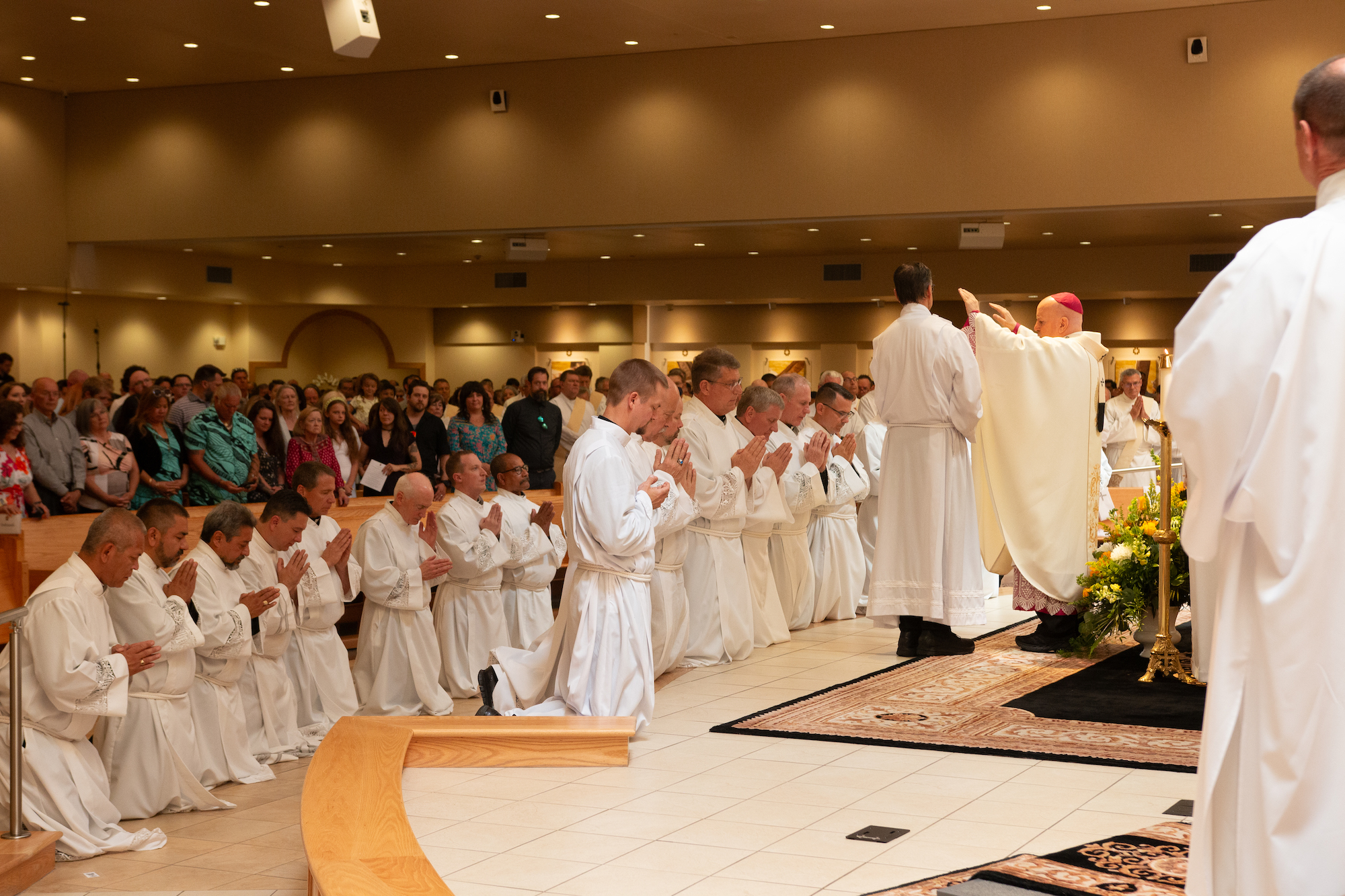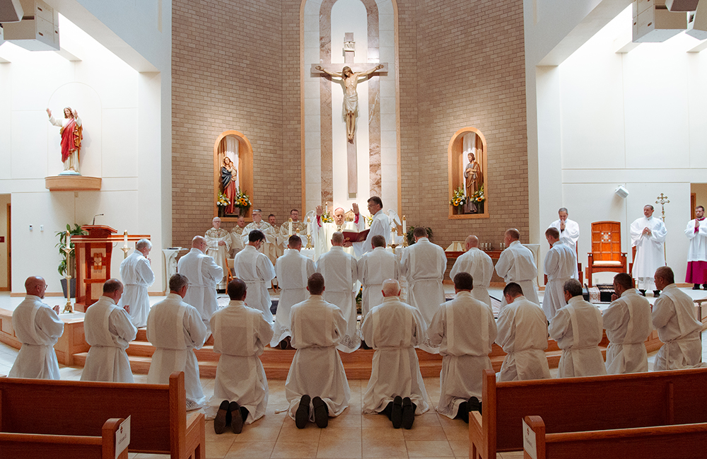 “Cada vez que se celebra la Eucaristía, hijos y hermanos míos, en esa entrega total de sí mismos y en ese servicio del altar, no solo renuevan su bautismo y confirmación, sino también su matrimonio”, dijo. “[Y] también es importante para ustedes tener sus prioridades en orden. Como Jesús nos ha enseñado, el amor de Dios siempre es lo primero. Luego está el amor de su esposa y de sus hijos. Y luego está el diaconado y su ministerio. Es importante que mientras intentan equilibrar esas vocaciones y esos llamados que el Señor les ha dado, siempre se mantengan enfocados en sus prioridades”.
