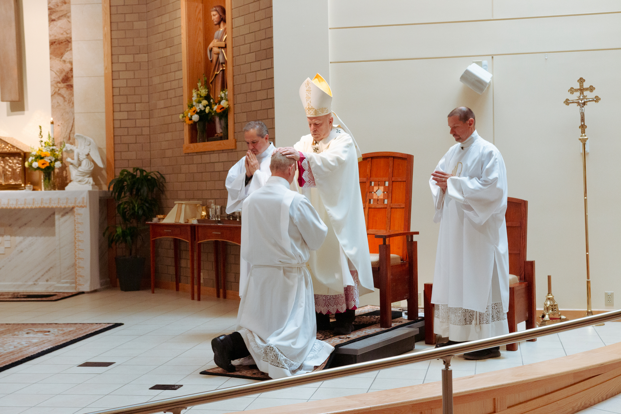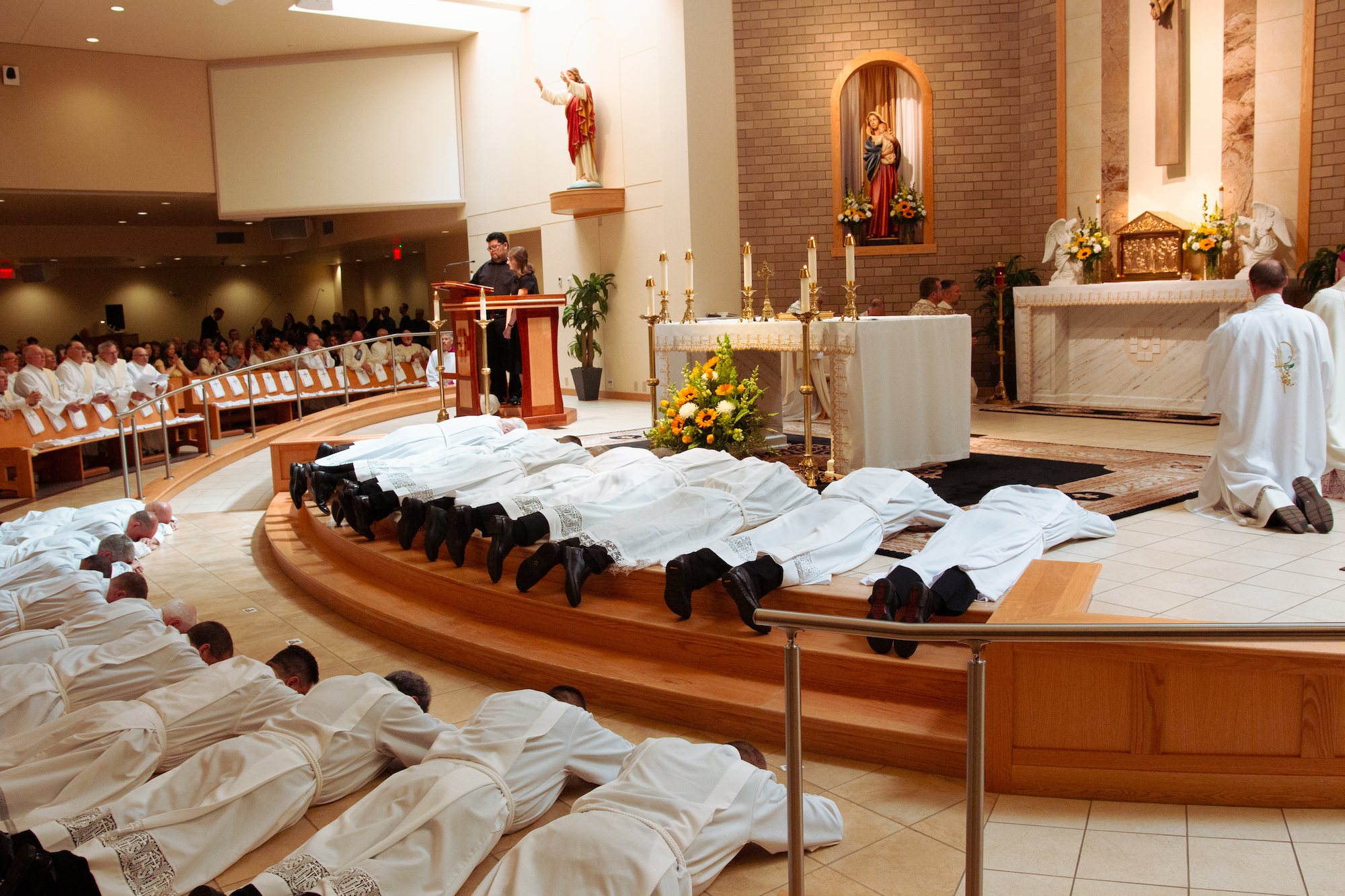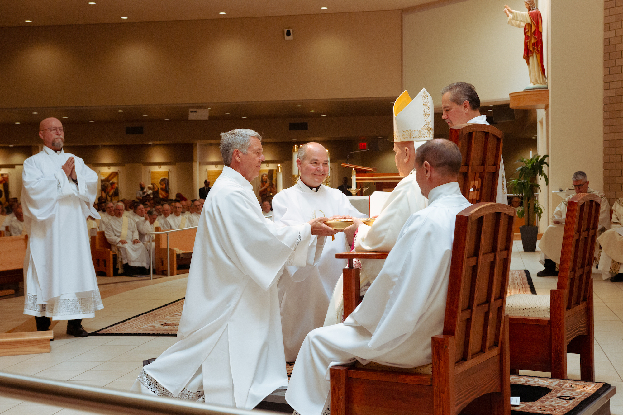 “Cada vez que se celebra la Eucaristía, hijos y hermanos míos, en esa entrega total de sí mismos y en ese servicio del altar, no solo renuevan su bautismo y confirmación, sino también su matrimonio”, dijo. “[Y] también es importante para ustedes tener sus prioridades en orden. Como Jesús nos ha enseñado, el amor de Dios siempre es lo primero. Luego está el amor de su esposa y de sus hijos. Y luego está el diaconado y su ministerio. Es importante que mientras intentan equilibrar esas vocaciones y esos llamados que el Señor les ha dado, siempre se mantengan enfocados en sus prioridades”.
