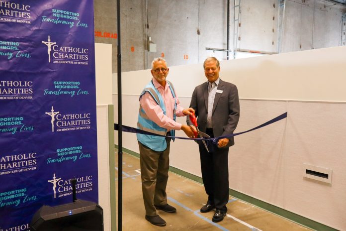 Para celebrar su instalación final, el equipo de Caridades Católicas de Denver invitó a la comunidad a asistir a una ceremonia de corte de cinta y bendición a finales del mes pasado. El padre Barnabas, capellán de Caridades Católicas de Denver, rezó y roció agua bendita sobre los 70 nuevos espacios para prepararlos para las participantes.