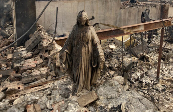 La arquidiócesis de Denver compartió una fotografía que se hizo viral, ya que muestra a una estatua de la Virgen María que permaneció de pie junto a los escombros de una casa quemada, durante el incendio forestal del jueves en Colorado.