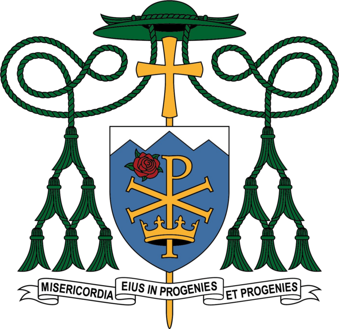 Cumbres: La parte superior del escudo, conocida como el “jefe”, tiene tres cumbres, la cumbre central más alta que las demás. Esto alude a las Montañas Rocosas de Colorado, un símbolo principal de la región en la que el Obispo-electo servirá.