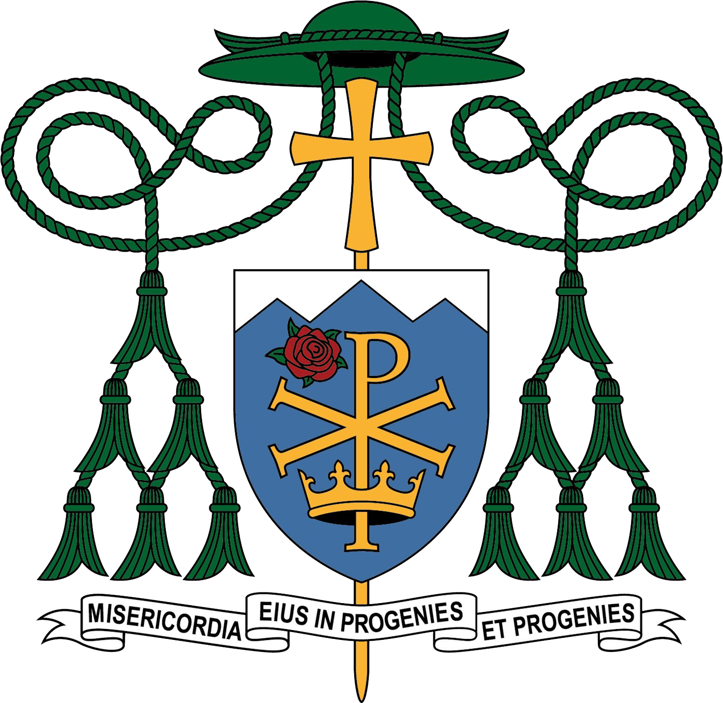 Blasón: La pieza principal del escudo episcopal es el blasón o escudo, que está representado aquí con un monograma dorado ornamentado en el frente del escudo. Las letras griegas Chi (la “X”) y Rho (la “P”) son las dos primeras letras de la palabra griega Christos, que significa Cristo. La corona que envuelve la parte inferior del Rho alude a Cristo Rey.