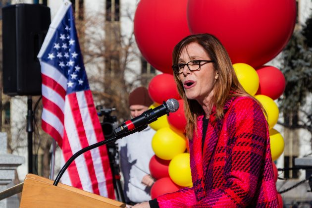 Lori Gimelsteyn, directora ejecutiva de Parents United, habla durante la manifestación de la Semana de la Elección Escolar en el Capitolio del Estado de Colorado el martes. (Foto de Matt Walker)