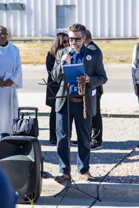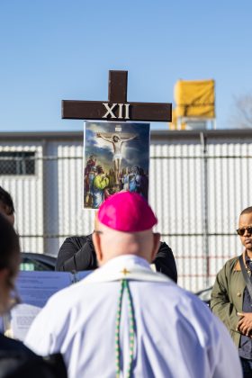 “Estamos frente al Centro de Detención de GEO, que de alguna manera simboliza el calvario de muchos de nuestros hermanos y hermanas, inmigrantes que vinieron con el sueño de un futuro mejor para sus familias, trabajaron duro para hacerlo realidad y despertaron enfrentando la deportación y la separación de sus seres queridos”, dijo el obispo Jorge al iniciar el viacrucis.