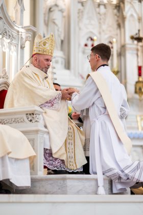 Cada vez que salgan a celebrar los sacramentos —especialmente la unción de los enfermos— y a mediar la misericordia y la compasión de Cristo a su pueblo herido, los nuevos sacerdotes, y en realidad todo el clero, deben “asegurarse de celebrarlos con la compasión de Jesús, con el amor de Jesús”, continuó el arzobispo, exhortando a los sacerdotes a buscar siempre la guía del Espíritu Santo en su ministerio.