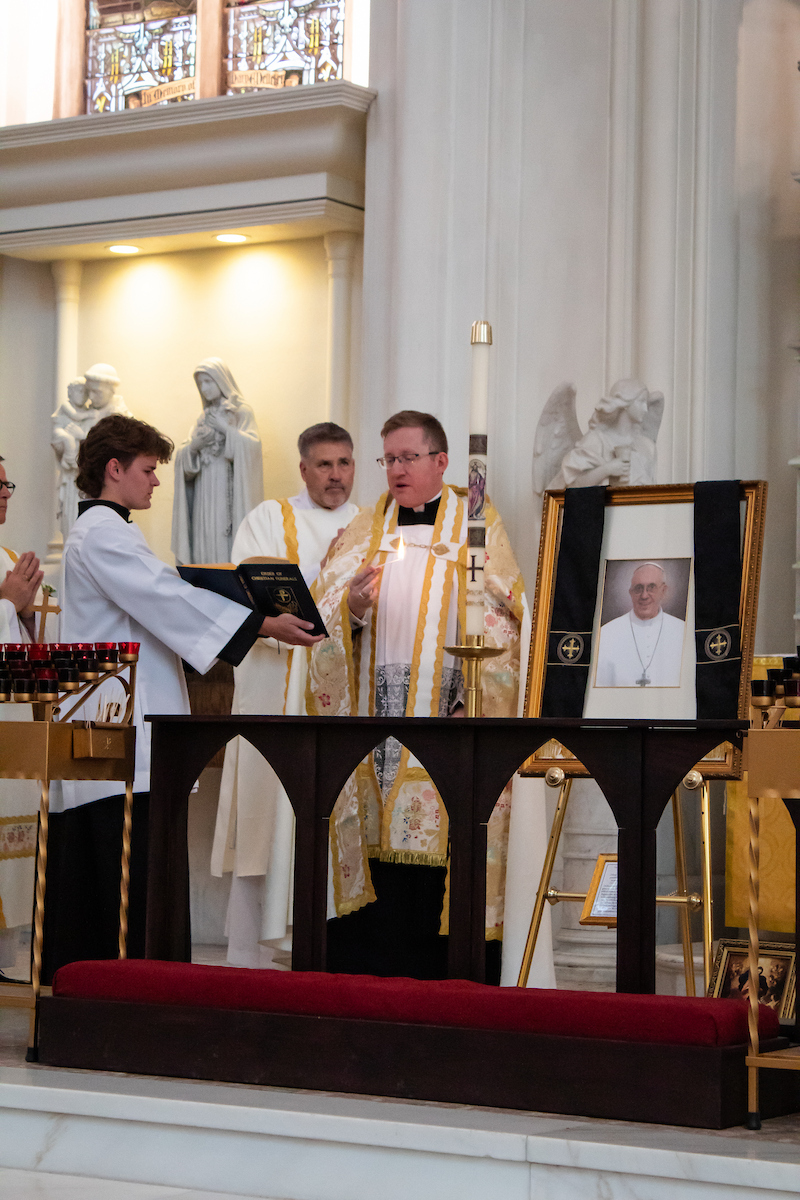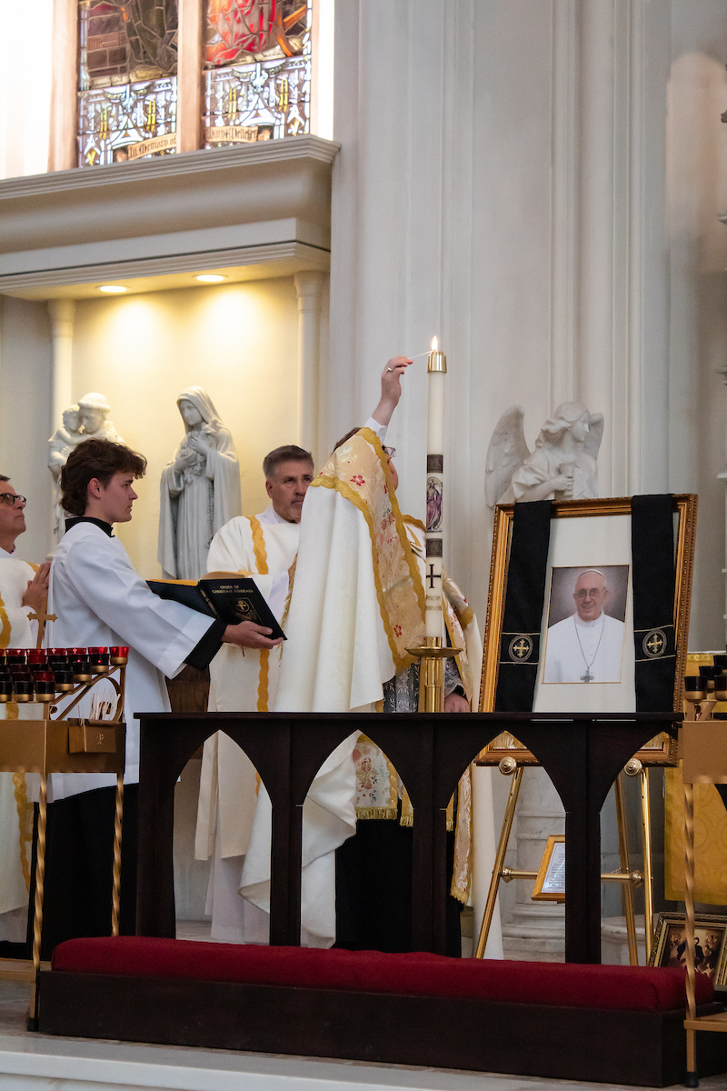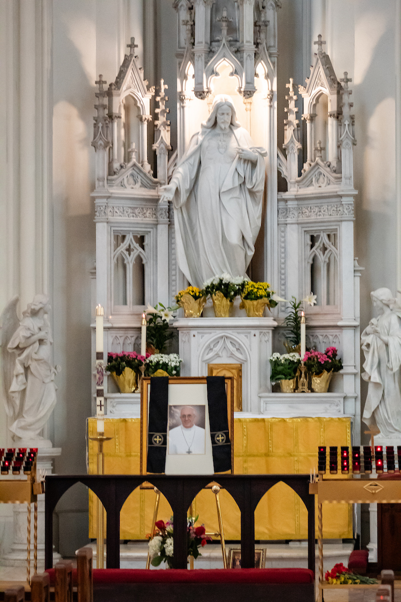Para cuando los fieles llegaron, la Catedral ya había hecho ciertos preparativos solemnes. Con la ayuda del Departamento de Bomberos de Denver, se colgó un listón negro sobre las puertas principales de la basílica, en señal del luto de la Iglesia por su padre espiritual. A la izquierda del santuario, frente al altar lateral dedicado al Sagrado Corazón de Jesús, se instaló un sencillo memorial para la oración en silencio. El ombrellino, símbolo de la autoridad del papa otorgado sólo a las basílicas del mundo para mostrar su conexión con el santo padre, estaba completamente cerrado, simbolizando la sede vacante — la Sede Apostólica vacante.
