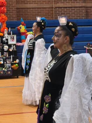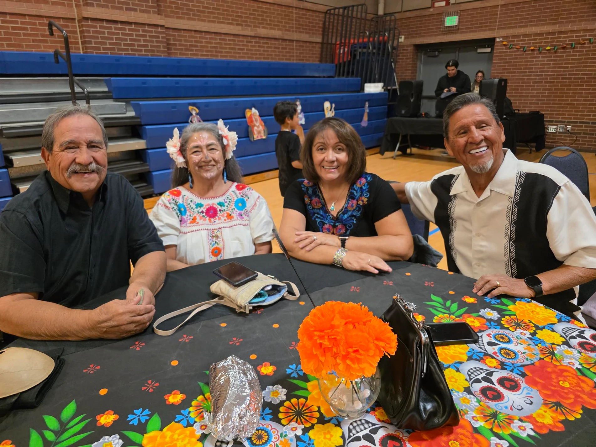 Colorida y llena de vida, la celebración del Día de los Muertos en la escuela estuvo cuidadosamente basada en la enseñanza de la Iglesia y entretejió diversas expresiones culturales. Los padres de familia organizadores se apresuraban a calentar tortillas y preparar tamales y chile rojo para los casi 400 invitados que llegarían en cualquier momento. Adornos vibrantes y más mesas con comida y bebida rodeaban el gimnasio para la fiesta. Las bailarinas de ballet folclórico ajustaban listones y rebozos de sus trajes tradicionales, y la ofrenda, el altar tradicional dedicado a los familiares que han fallecido, estaba ya montada con fotos de seres queridos que llenaban el espacio.