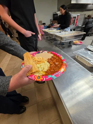 El evento fue realmente un esfuerzo comunitario. Padres, madres y abuelos trabajaron toda la semana para preparar la comida tradicional mexicana, incluidos tamales caseros y chile rojo. Los patrocinadores ayudaron donando tortillas, totopos, queso, arroz y frijoles. Una de las organizadoras incluso pasó todo el día preparando postres mexicanos para que todos los disfrutaran.