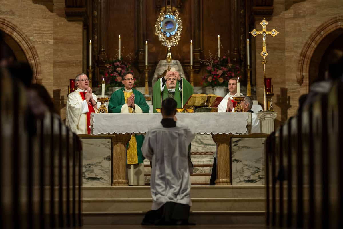DENVER, CO - 9 DE FEBRERO: El obispo auxiliar de Denver Jorge Rodríguez, eleva la Eucaristía durante la Misa de la Jornada Mundial del Enfermo, en la Iglesia Holy Ghost. (Foto de Daniel Petty)