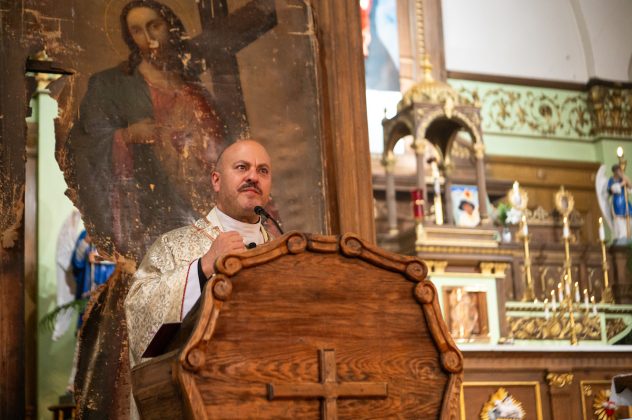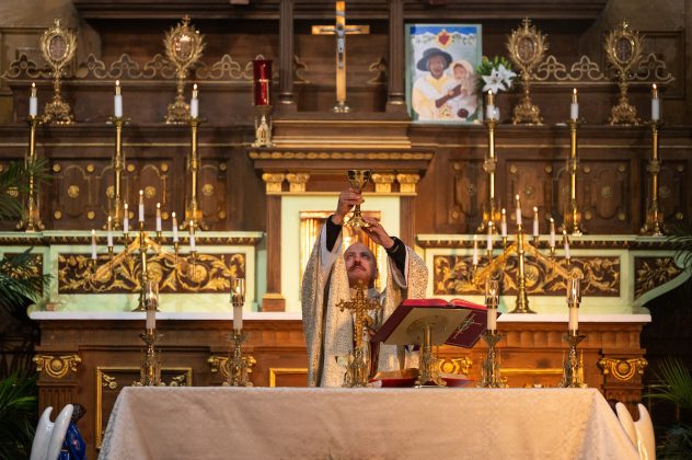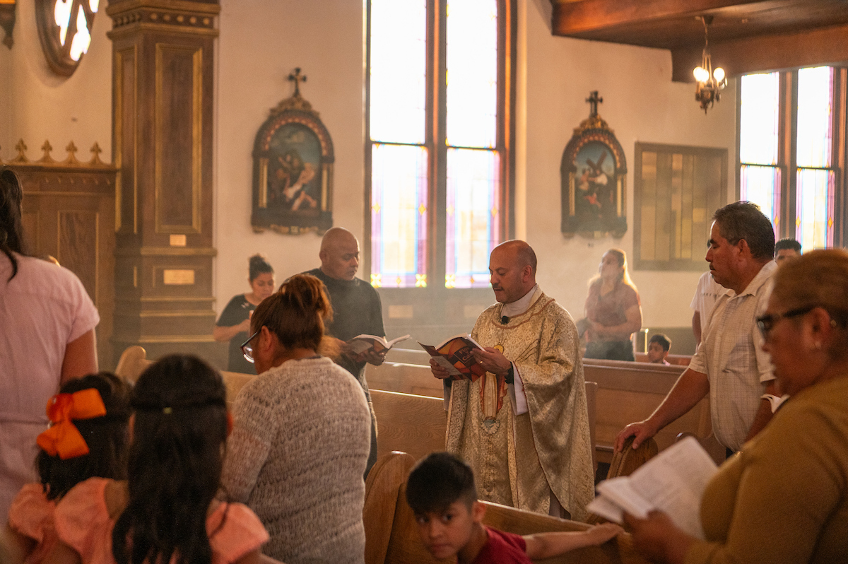 De pie desde el púlpito, con una pintura carbonizada de siglos de antigüedad a sus espaldas, el padre Eric Zegeer continuó su homilía en la parroquia del Sacred Heart de Denver el viernes pasado por la noche, día festivo de la parroquia: