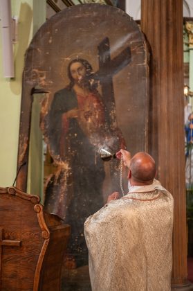 La imagen a su espalda era una pintura de tamaño real de Cristo, sosteniendo la cruz, e indicando a los fieles su Sagrado Corazón. El padre Eric la sacó del almacén el viernes, Solemnidad del Sagrado Corazón de Jesús, para la Hora Santa, la Misa y la celebración comunitaria de la parroquia, en colaboración con el Apostolado de las Madres Espirituales Arquidiocesanas. La imagen ha estado en la iglesia durante más de cien años, y aunque sufrió daños en el incendio que destruyó gran parte del edificio a principios del siglo XX, sobrevivió, al igual que la comunidad parroquial. Era una de las imágenes favoritas de la sierva de Dios Julia Greeley, una esclava emancipada que conoció la fe en esta misma parroquia a finales del siglo XIX y que consideró la iglesia su hogar para el resto de su vida. El padre Eric continuó: