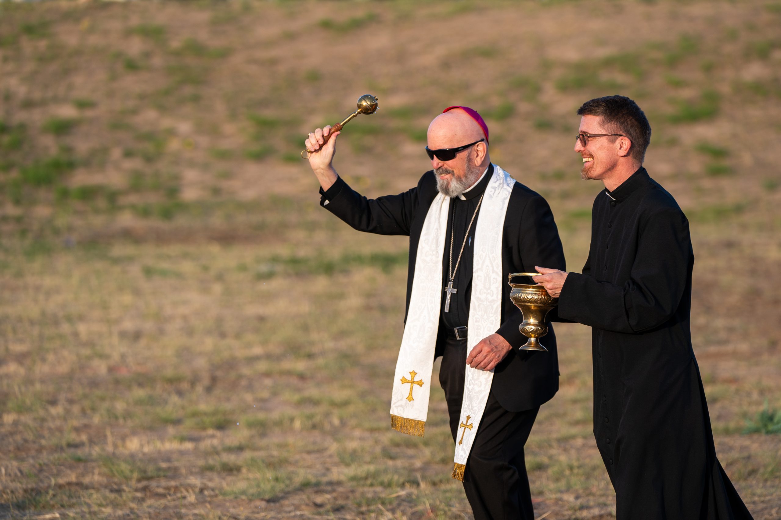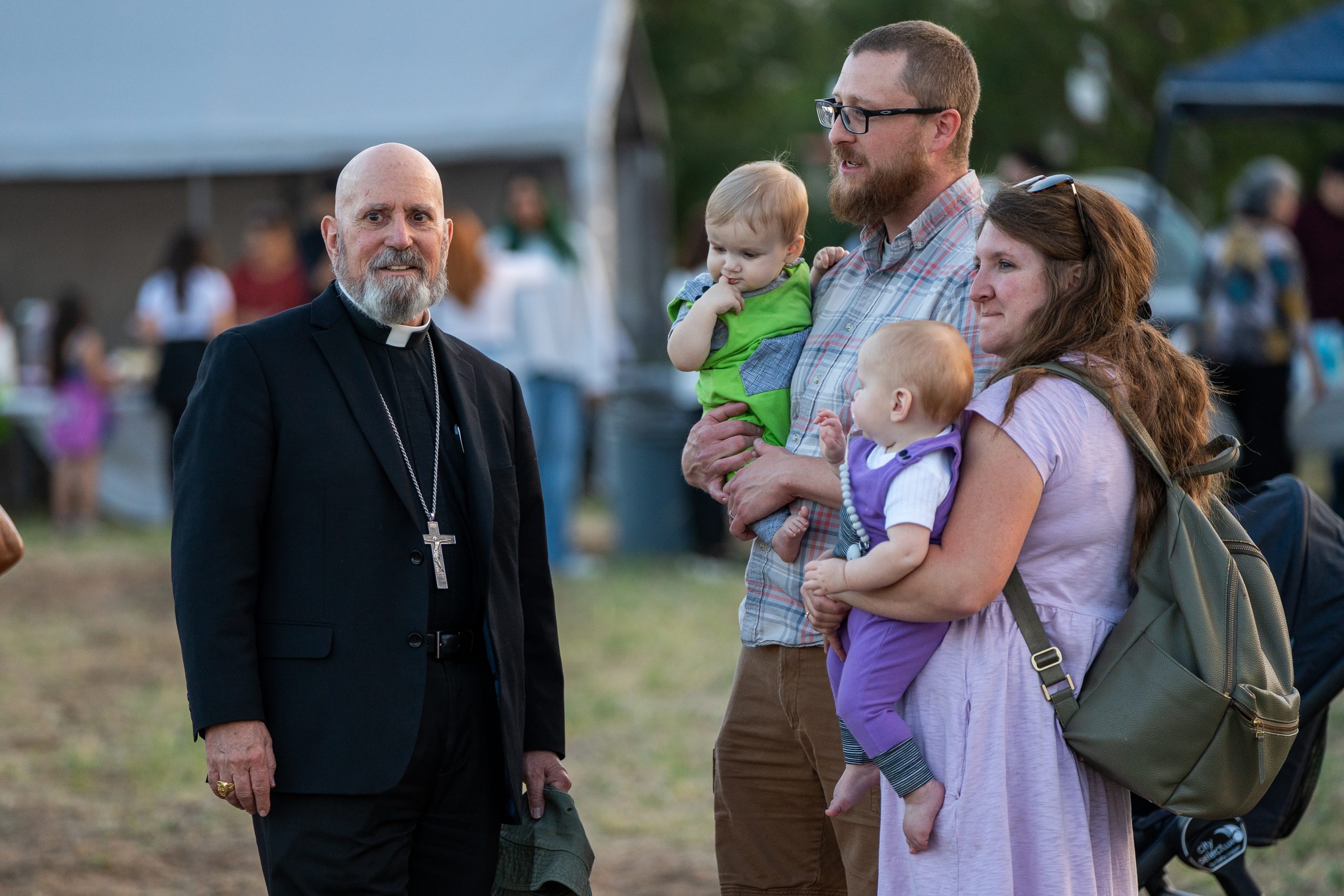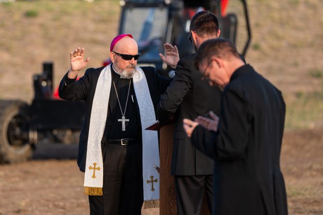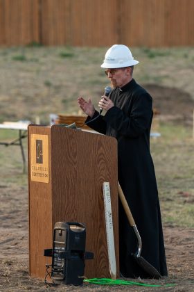 El terreno de tres acres en el que se construirá la parroquia, ubicado en la intersección de Green Valley Ranch Blvd. y Jebel St., fue bendecido por el arzobispo Samuel J. Aquila durante una alegre ceremonia de inauguración que reunió a feligreses, amigos y benefactores de la parroquia, así como a representantes de los grupos de arquitectura y construcción que están diseñando y construyendo la iglesia.