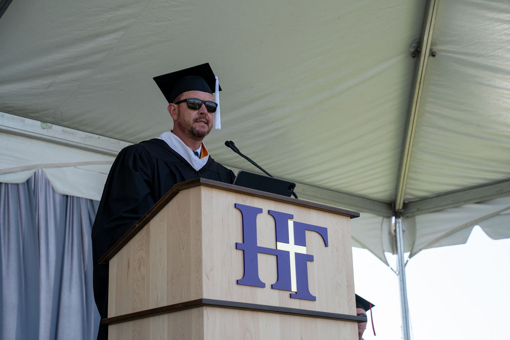 El presidente de Holy Family, Mike D. Gabriel, habla a los estudiantes de último año.