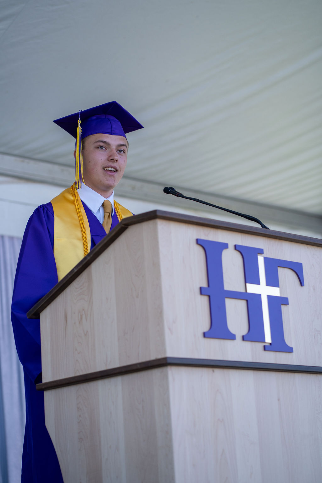 El estudiante de Holy Family, Kolton Paulson, se dirige a sus compañeros de clase.
