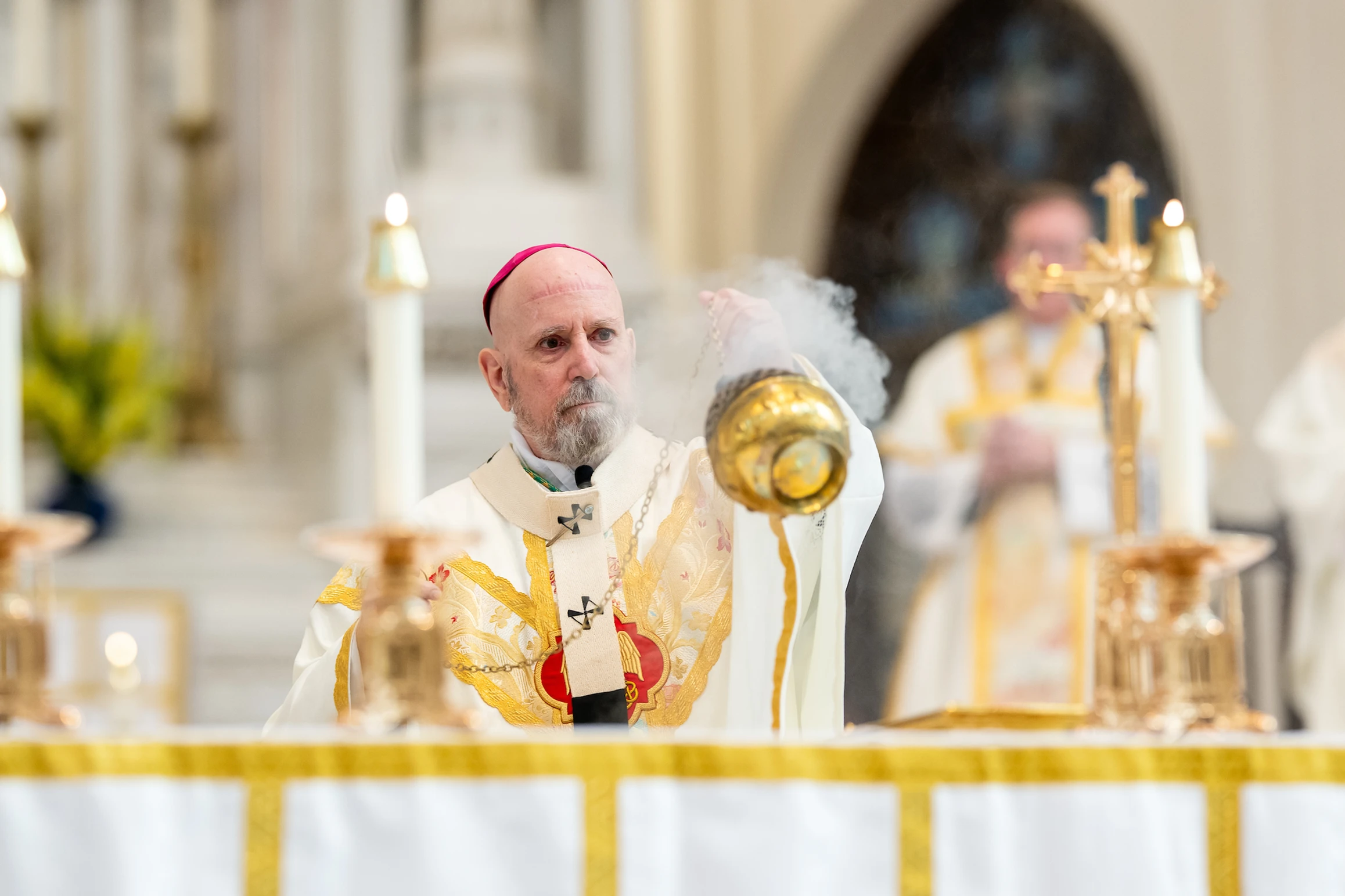 El arzobispo Samuel Aquila inciensa el altar durante la Misa que concluye nueve días de luto por el papa Francisco. (Foto: Daniel Petty)