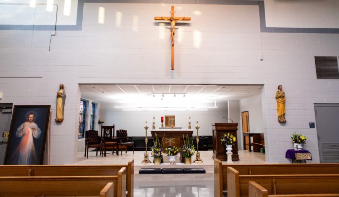 El padre James Spahn, párroco de la parroquia St. John Paul II, que actualmente utiliza este lugar como hogar provisional mientras se construye su iglesia, compartió con gratitud y recordó con cariño los comienzos sencillos del lugar, “Y miren hasta dónde hemos llegado, de esta cafetería sencilla y entusiasta a una hermosa capilla con bancas».