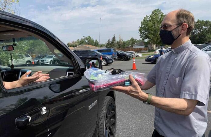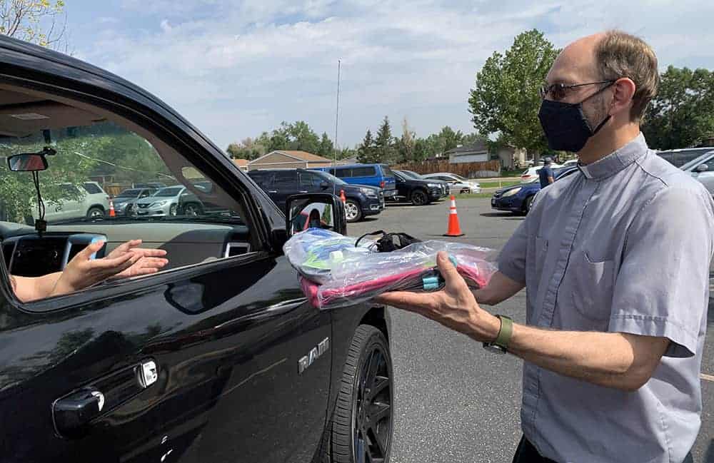 Imagen destacada: El padre Dan Norick reparte suministros durante un evento de obsequio comunitario organizado en la parroquia católica Ascensión en Montbello junto con la ciudad de Denver. (Foto proporcionada)