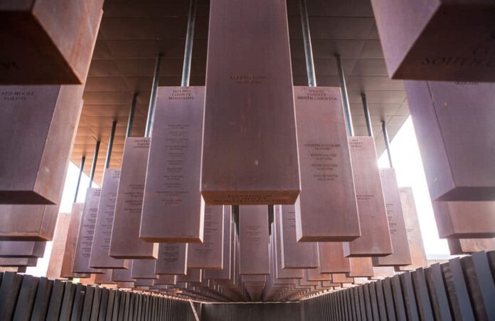 Imagen de portada: El National Memorial en Montgomery, Al., Presenta 800 columnas de acero desgastadas que cuelgan de un techo. Cada columna presenta el nombre de un condado estadounidense y está grabado con los nombres de las personas que fueron linchadas allí. (Foto por Soniakapadia | Wikipedia)