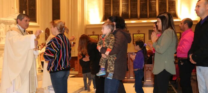 Antes de venir fui a recoger parte de estos “adornitos” que me pongo (refiriéndose a las insignias episcopales n.d.r) en la sacristía y vi que los del grupo de oración de Holy Cross estaban haciendo adoración al Santísimo porque hoy comienzan el curso Felipe, y los ves ahí de rodillas pidiéndole a Dios que les bendiga en este ministerio; solo este hecho es un tratado de teología, de fe, de la gracia que viene de Dios, de la oración humilde del hombre, esa fe sencilla que nos gusta a nosotros celebrar, el modo como hablamos nosotros de la Virgen, la Virgencita, el respeto que tenemos por el Santo Padre, por la Iglesia, el respeto por nuestros sacerdotes, eso es algo que nosotros traemos a este país y lo traemos y está floreciendo en nuestras comunidades, que hace que otras personas nos miren y recuerden si han olvidado esos principios o que asuman estos valores y que nosotros podemos enriquecer a la comunidad de Estados Unidos.