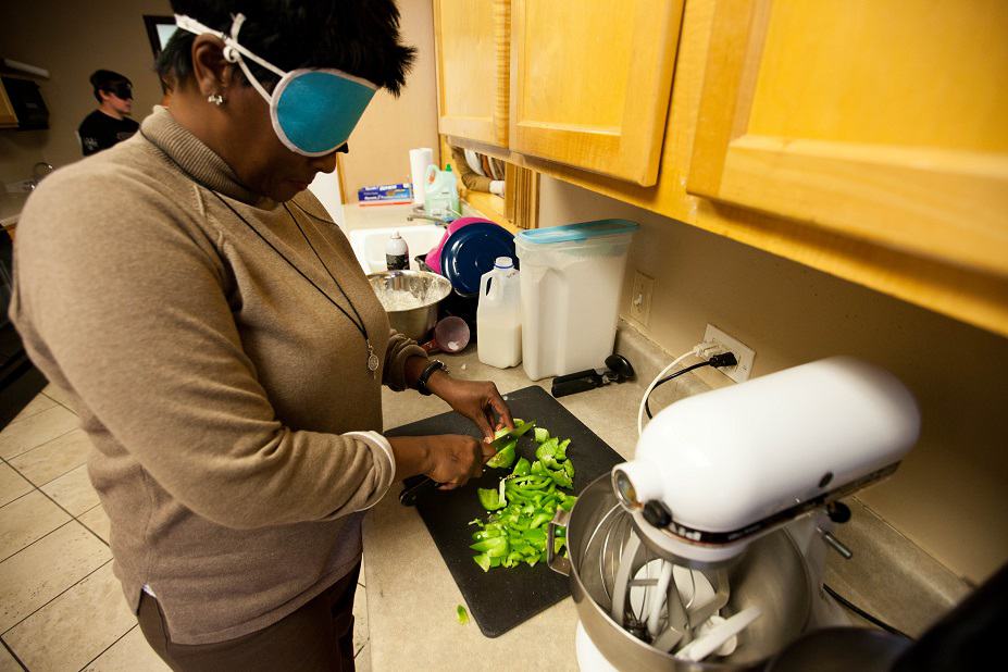 Está preparando su cena de graduación para 75 personas, como parte de los nueve meses de entrenamiento en la Colorado School for the Blind (Escuela de Colorado para ciegos) donde aprendió a manejar su discapacidad y re-aprender algunas tareas ordinarias, ahora como alguien que ha perdido la vista.