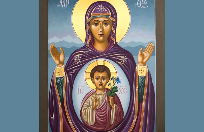 El icono resultante de Nuestra Señora del Nuevo Adviento capta tanto la universalidad de la maternidad de María como la belleza particular de Colorado. En la imagen, María viste de morado de Adviento, color de anhelo y preparación. Sus manos están levantadas en la postura orante, el gesto antiguo de intercesión, recordando a quienes la contemplan que ella ora constantemente por la Iglesia y por el mundo.