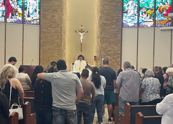 Terminando la Misa, el padre Víctor invitó a los padres a acercarse al altar donde esparció agua bendita sobre ellos y les dio una bendición especial. A través de la Misa Anual de Niños, las familias saben que “nunca están solas en este camino”, dice Jessica.