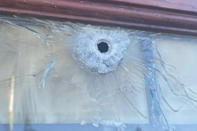 Las fotos enviadas a CNA muestran daños en el exterior de la iglesia, incluido un agujero de bala en una ventana. Las puertas y los marcos de puertas también sufrieron daños. Las fotos muestran una ventana exterior rota sobre una entrada de dos puertas con vidrios rotos por debajo.