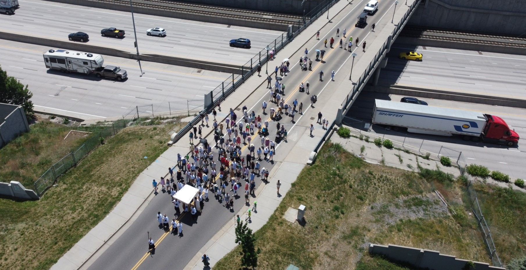 En conmemoración al domingo de Corpus Christi, muchas parroquias alrededor de la arquidiócesis de Denver salieron a las calles para honrar a Nuestro Señor presente en la Eucaristía. Dando testimonio de nuestra fe, los feligreses acompañaron a Jesús por las banquetas y calles, ¡e incluso sobre las autopistas!
