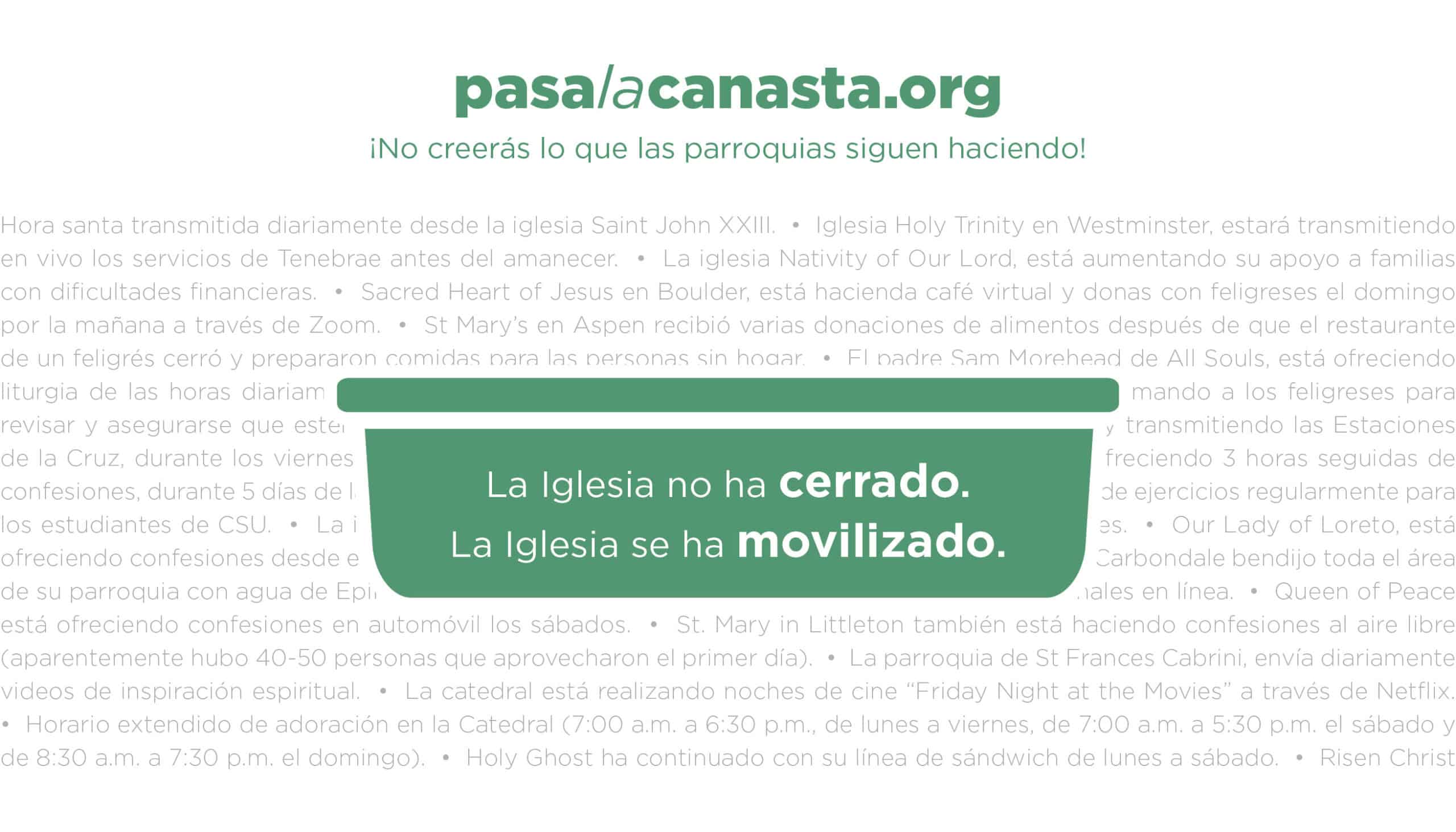 InicioSin categorizar#PasaLaCanasta: ¡Apoya a tu parroquia ahora mismo! Sin categorizar #PasaLaCanasta: ¡Apoya a tu parroquia ahora mismo! Por Equipo de El Pueblo Católico abril 5, 2020 FacebookTwitterPinterestWhatsApp FacebookTwitterPinterestWhatsApp Artículo anteriorAun sin misas públicas, nuestras iglesias siguen activas y ocupadasArtículo siguienteRecursos para vivir la Semana Santa en familia Equipo de El Pueblo Católico Artículos relacionados Arquidiócesis de Denver FOTOS: Cientos elevan su oración en un emotivo viacrucis por los migrantes en el centro de detención de ICE en Aurora noviembre 22, 2025 Sin categorizar Acompañamiento hacia la vida eterna: aprendizajes sobre la muerte y la esperanza noviembre 20, 2025 Sin categorizar Pasillos de hospital convertidos en tierra santa: ministros extraordinarios comparten el amor sanador de Cristo noviembre 14, 2025 Lo último Familias de Colorado se manifiestan en el Capitolio en la Semana de la Elección Escolar enero 29, 2026 Un llamado pastoral a la paz del arzobispo Samuel Aquila enero 29, 2026 Creados para pertenecer: Cómo la escuela preparatoria Holy Family está ampliando la educación católica enero 29, 2026