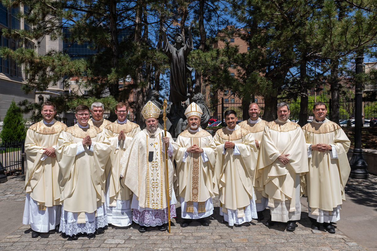 Sacerdotes del ministerio del seminario posan con los recién ordenados, el arzobispo Samuel Aquila y el obispo Jorge Rodríguez. (Foto: Dan Petty)
