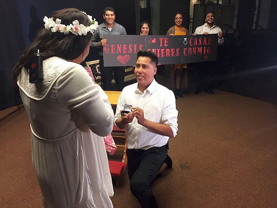 Y se llegó el día. Ella confiesa que vio a Juan algo nervioso, pero le pareció normal, pues era su primera presentación. También se sorprendió de que llegaran tantos amigos y parientes a ver la obra, pero pensó que era porque la querían ver en escena. “Antes de salir al escenario Juan me dio un beso en la frente. Él no suele ser así”, cuenta Génesis. Al finalizar la obra, en el momento de los aplausos y las venias, Juan fue por un ramo de flores. “Quizás son para Gabriela, la directora”, pensó Génesis, pero Juan se dirigió a su novia también con un anillo. Mientras tanto unos amigos suyos subieron al escenario con un letrero que decía: “¿Te quieres casar conmigo?”.  “Las piernas se me pusieron como un espagueti”, confesó Génesis, quien, emocionada (y enamorada) aceptó la propuesta delante del púbico que no paraba de aplaudir.