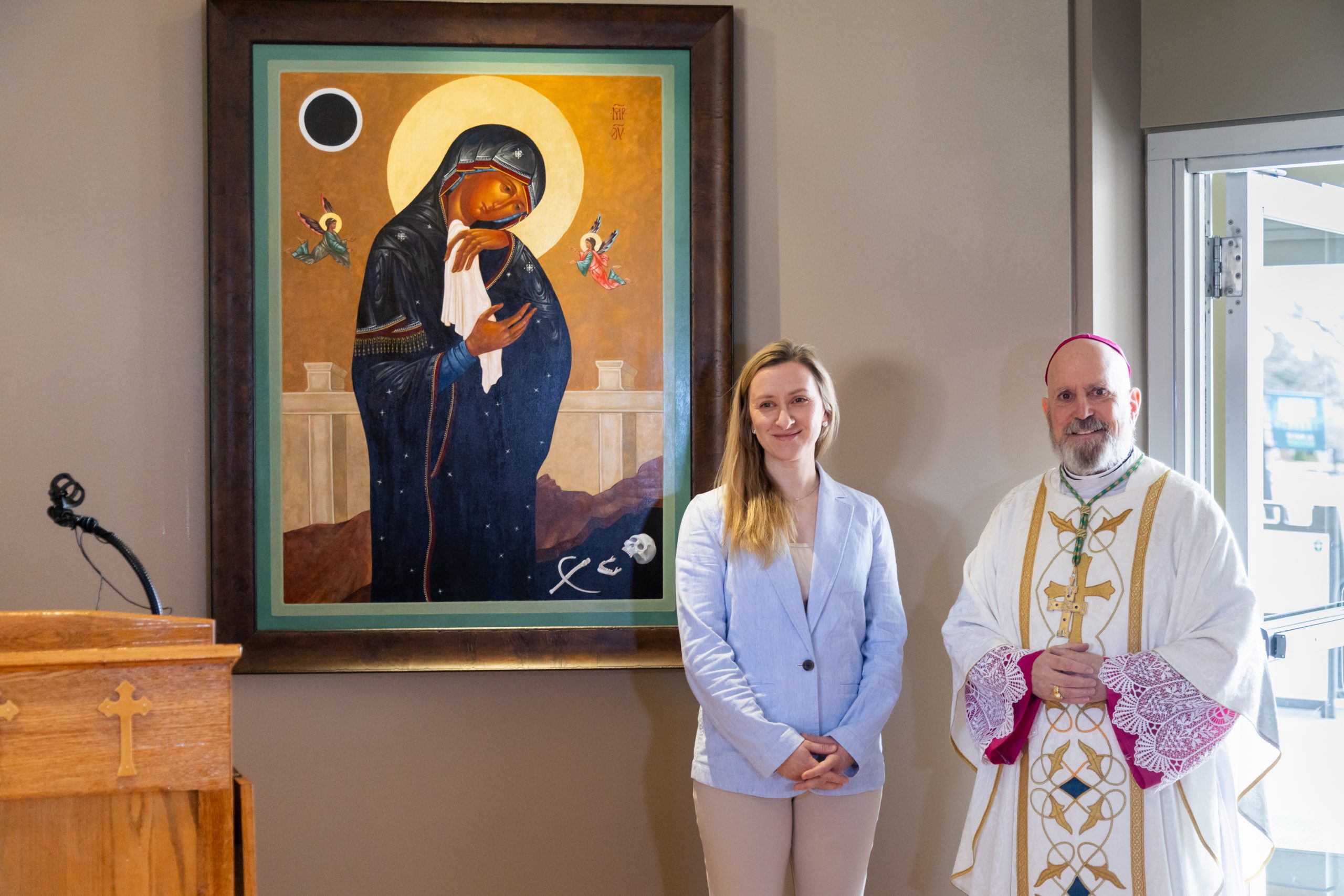 “El propósito del arte sacro es ayudarnos a orar, orar juntos y centrar nuestros pensamientos en las verdades trascendentes de nuestra fe”, dijo Elizabeth. “Tuve muchas horas para sentarme con la Virgen María al pie de la Cruz mientras pintaba. Pensé en la magnitud de ese momento, su Inmaculado Corazón atravesado por una espada, el maligno perdiendo y su gran amor por nosotros y por nuestra arquidiócesis. Oré por todos ustedes mientras trabajaba. Que esta imagen sea una bendición para ustedes”.
