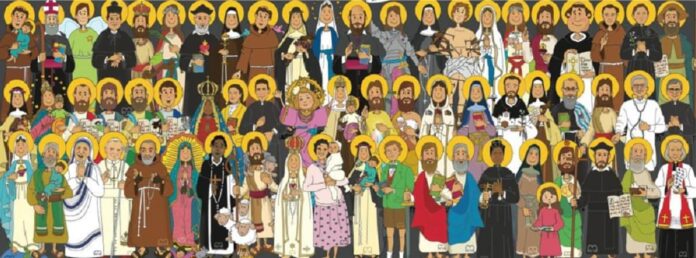 Los santos forman parte de esa muchedumbre de hombres y mujeres que el libro del Apocalipsis describe como incontable, de toda raza y nación que vestidos con túnicas blancas adoran al Cordero en la liturgia celeste. Sólo Dios sabe el nombre de cada uno de ellos. Muchos incluso son, a lo mejor, conocidos o seres queridos nuestros.