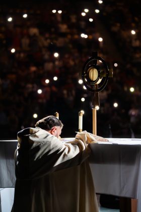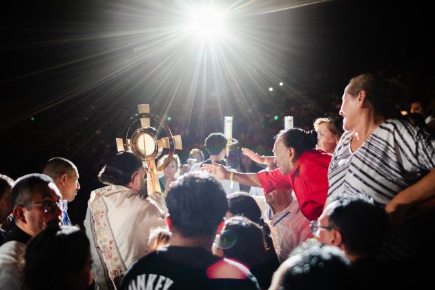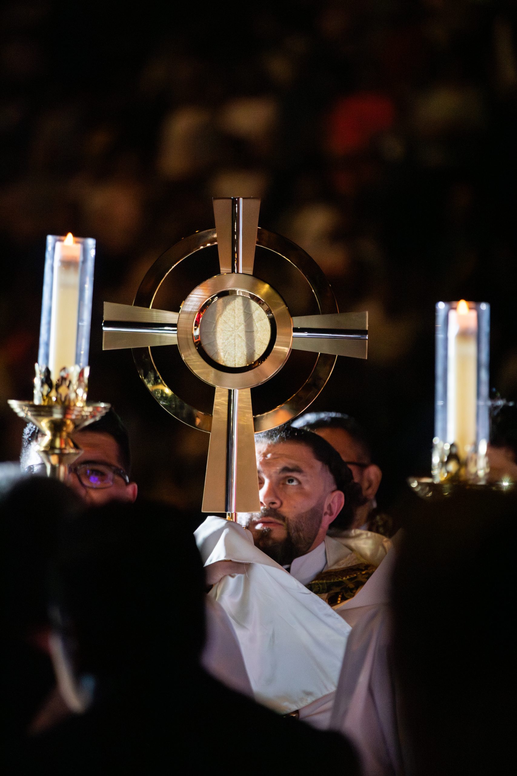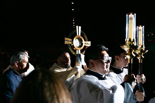 Uno de los momentos más emotivos del evento fue, sin duda, la hora santa. Jesús Sacramentado se hizo presente en medio de la multitud, mientras los fieles se acercaban con devoción, deseando recibirlo en su corazón e incluso, si era posible, tocarlo con un pañuelo como un acto de fe y anhelo por sus gracias — una práctica inspirada en el pasaje del Evangelio de Marcos 5, 25-34, donde una mujer enferma toca el manto de Jesús y es sanada por su fe.