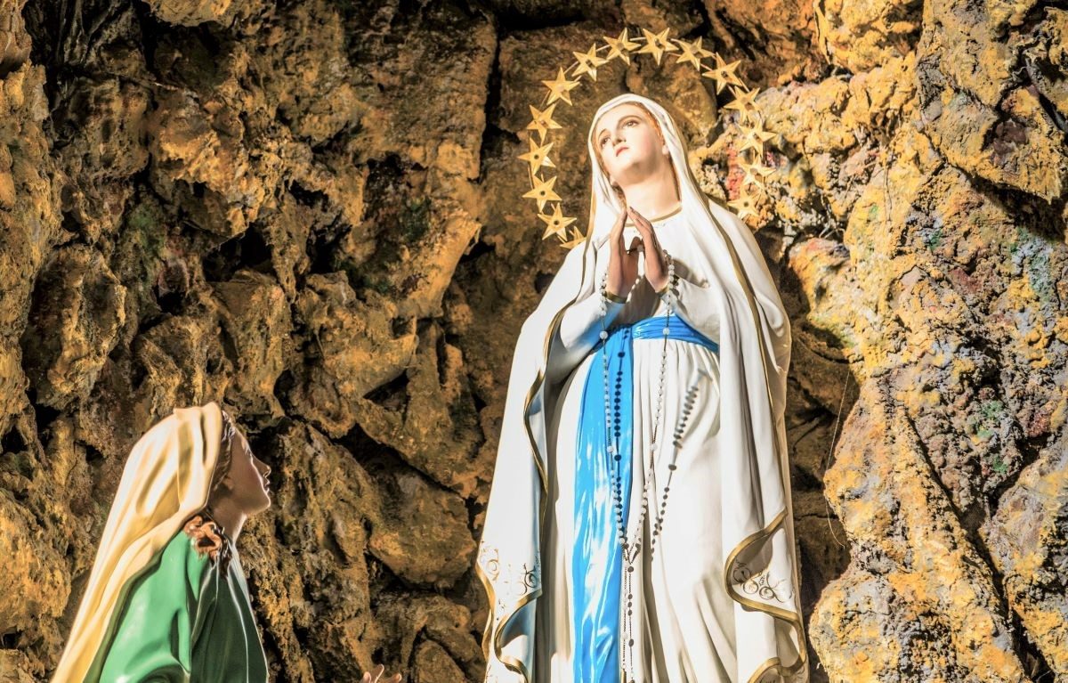 Cierto día fui a la orilla del río Gave a recoger leña con otras dos niñas. En seguida oí como un ruido. Miré a la pradera, pero los árboles no se movían. Alcé entonces la cabeza hacia la gruta y vi a una mujer vestida de blanco, con un cinturón azul celeste y sobre cada uno de sus pies una rosa amarilla, del mismo color que las cuentas de su rosario.