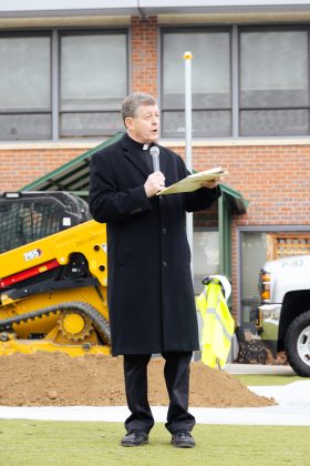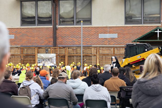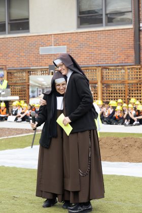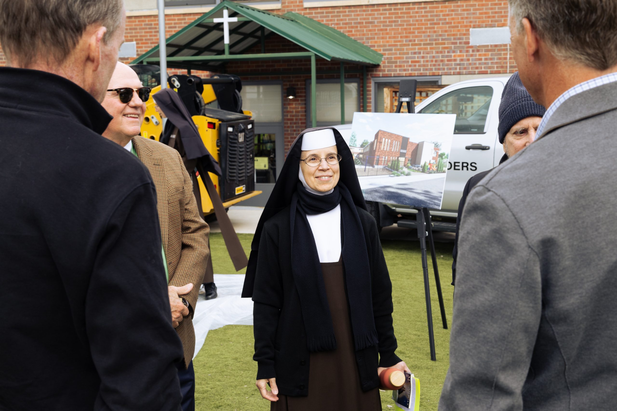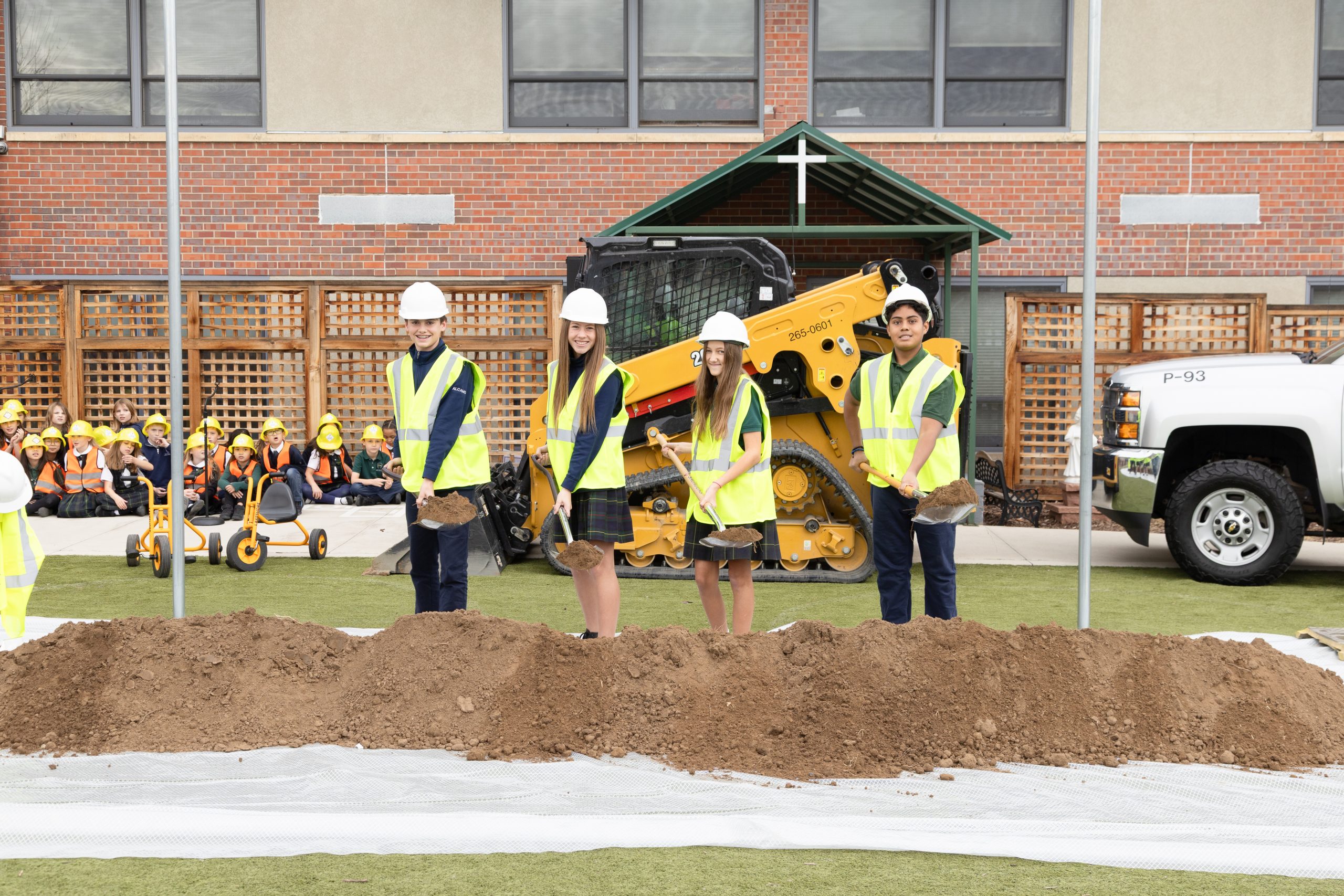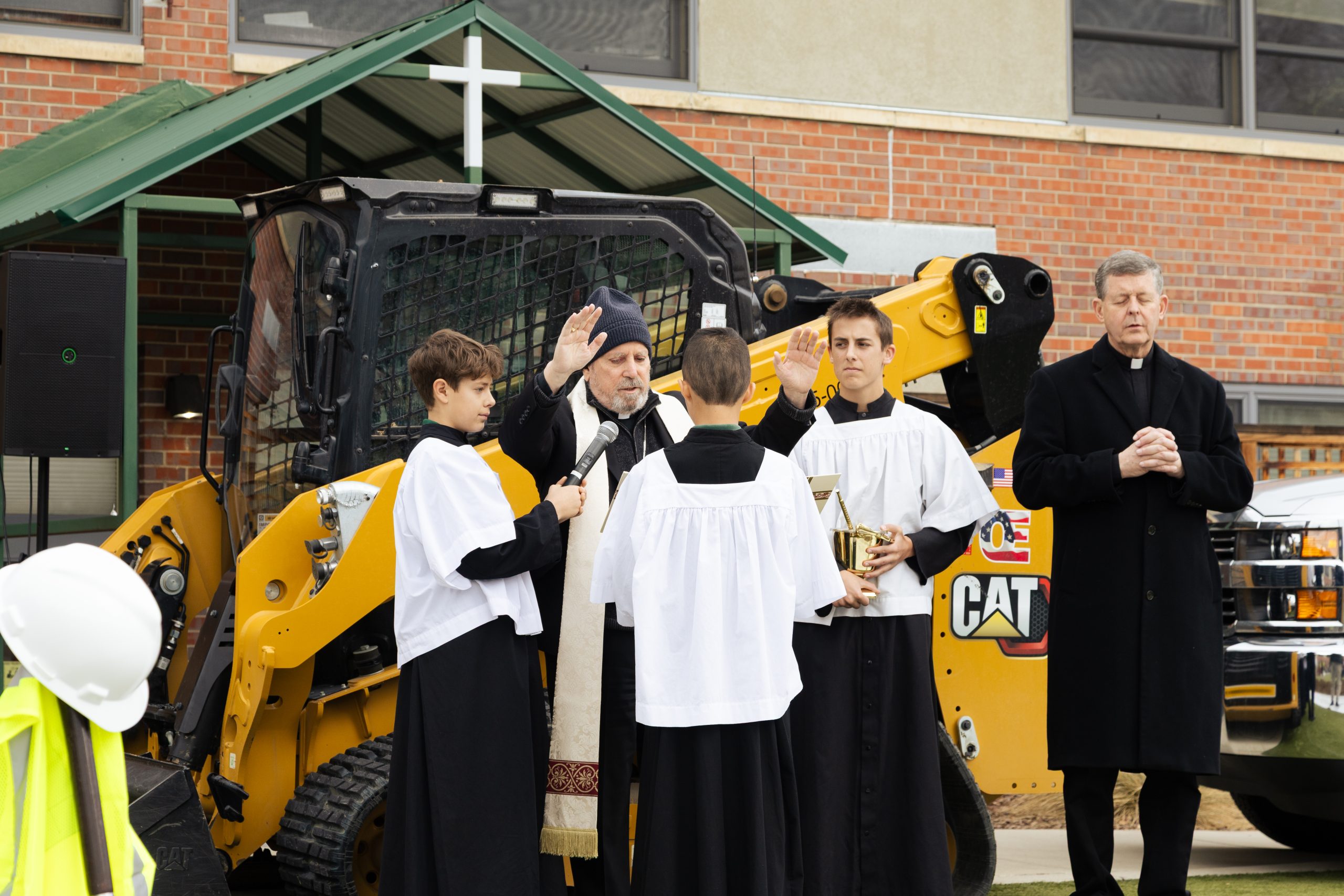 Luego, con las palas listas y las oraciones elevándose, la comunidad celebró la primera palada de una importante ampliación escolar que añadirá siete salones, una capilla, un patio interior, una oficina para la consejera, una enfermería renovada, un elevador y más. El nuevo edificio marcará el inicio de un capítulo renovado en la misión de la escuela de formar santos y académicos para las generaciones futuras.